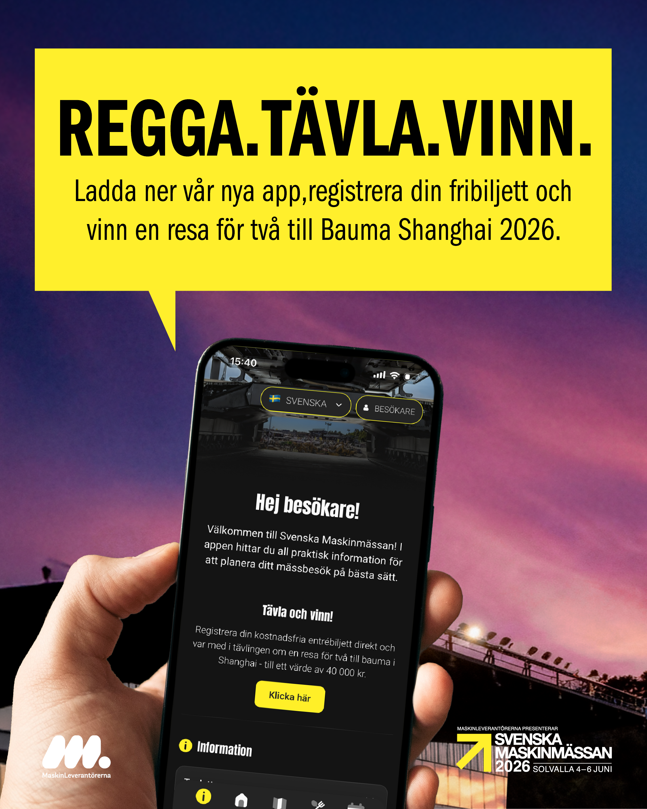 Ladda ner vår appen, registrera din fribiljett via appen och sedan är du med i vår exklusiva tävling där ni har chans att vinna en resa för två till Bauma Shanghai den 24–27 november 2026.